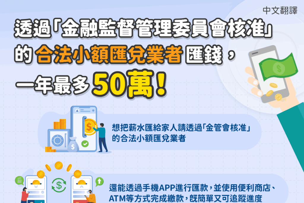 移工宣導|透過「金融監督管理委員會核准」的合法小額匯兌業者匯錢,一年最多50萬!-多國語