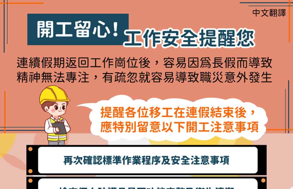 移工宣導|開工留心!工作安全提醒您-多國語