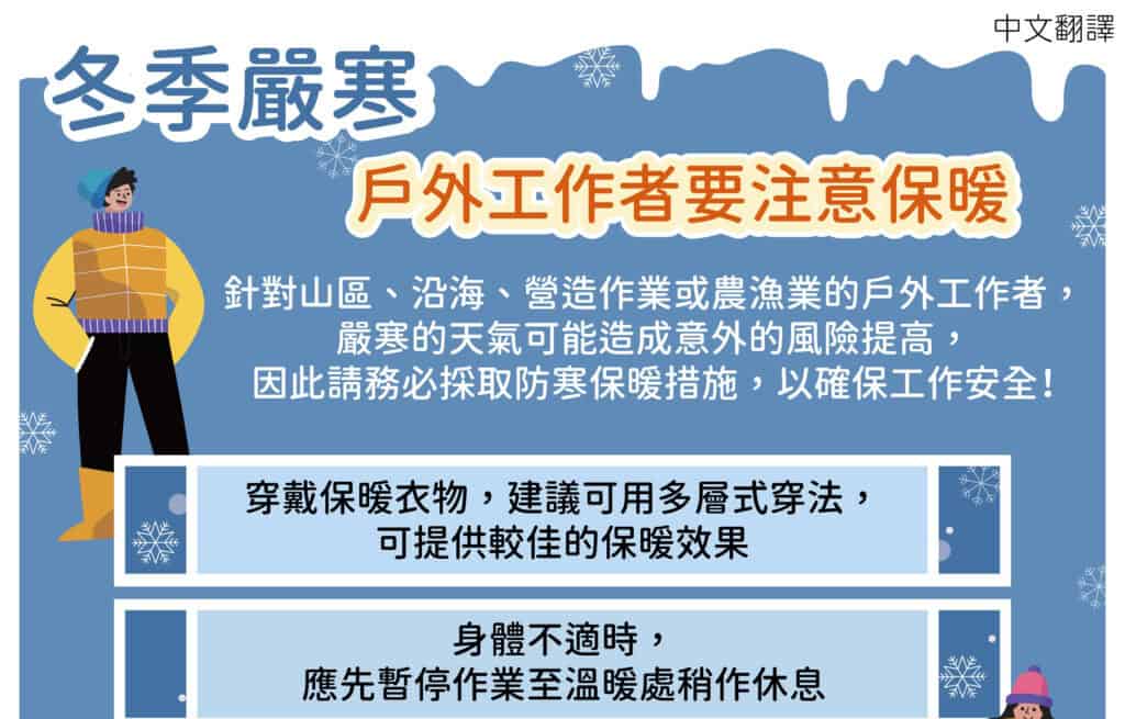 移工宣導|冬季嚴寒,戶外工作者要注意保暖-多國語