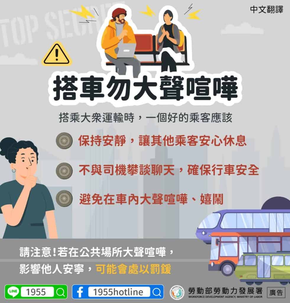 移工宣導|搭車請注意音量,大聲喧嘩恐遭罰款!(交通)-多國語
